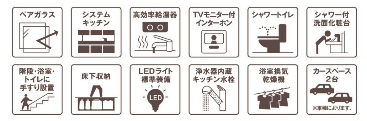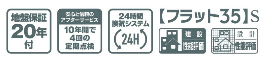 | 設備条件 | バリアフリー / 建設住宅性能評価書付 / 室内洗濯機置場 / 24時間換気システム / 電気有 / 照明器具付き / ガスコンロ / 対面式キッチン / バス・トイレ別 / 追焚機能浴室 / 浴室乾燥機 / 温水洗浄便座 / 洗髪洗面化粧台 / トイレ2ヶ所 / 浴室1坪以上 / 独立洗面台 / 床下収納 / ウォークインシューズクロゼット / TVモニタ付インターホン / 複層ガラス / ディンプルキー | ||