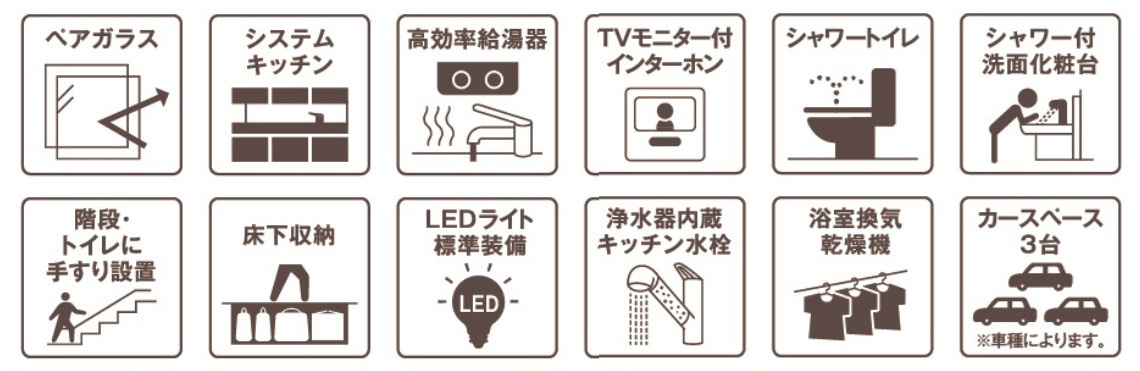 | 設備条件 | 建設住宅性能評価書付 / 室内洗濯機置場 / 24時間換気システム / 電気有 / 照明器具付き / ガスコンロ / 対面式キッチン / バス・トイレ別 / 追焚機能浴室 / 浴室乾燥機 / 温水洗浄便座 / 洗髪洗面化粧台 / トイレ2ヶ所 / 浴室1坪以上 / 独立洗面台 / 床下収納 / 収納豊富 / TVモニタ付インターホン / ディンプルキー | ||