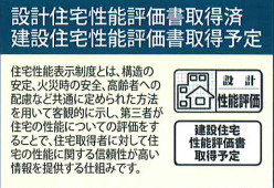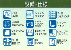 | 設備条件 | 建設住宅性能評価書付 / 室内洗濯機置場 / バルコニー / ガスコンロ / 対面式キッチン / バス・トイレ別 / 温水洗浄便座 / 洗髪洗面化粧台 / 浴室1坪以上 / 独立洗面台 / 床下収納 / TVモニタ付インターホン / 複層ガラス | ||