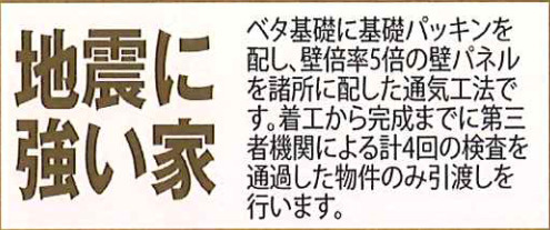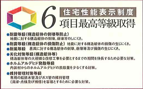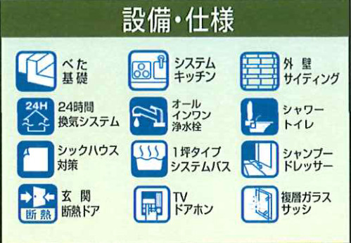 | 設備条件 | 建設住宅性能評価書付 / 室内洗濯機置場 / 24時間換気システム / 電気有 / ガスコンロ / 対面式キッチン / バス・トイレ別 / 追焚機能浴室 / 浴室乾燥機 / 温水洗浄便座 / 洗髪洗面化粧台 / トイレ2ヶ所 / 浴室1坪以上 / 独立洗面台 / 床下収納 / TVモニタ付インターホン / 複層ガラス | ||